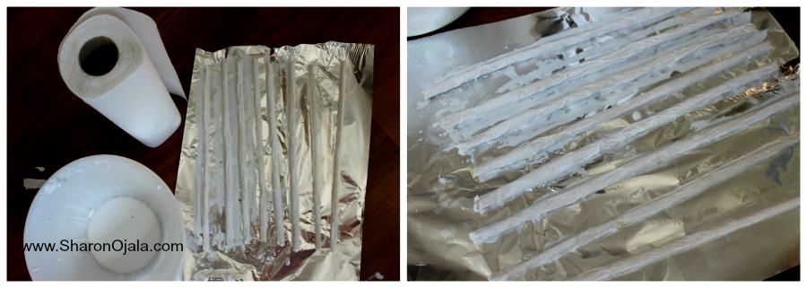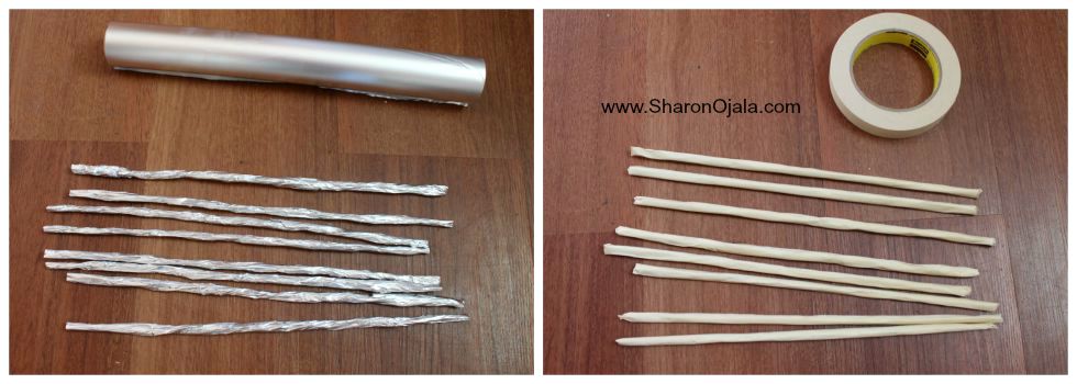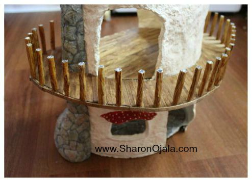 The sticks holding up the railing cap. I could have used real sticks but decided to make them instead. I used rolled foil wrapped in masking tape then covered in glue soaked paper towel.