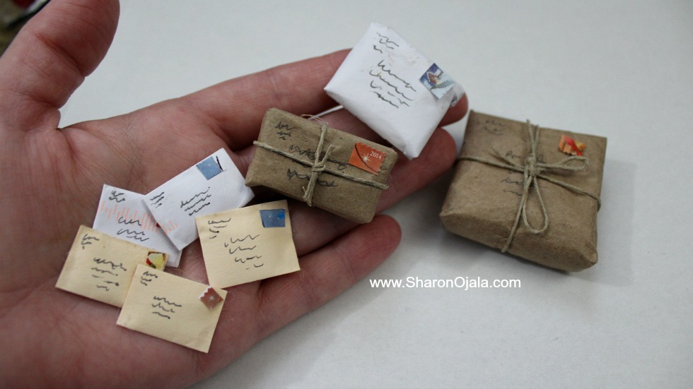 With this Gnome Home it seems almost everything I make has some sentimental value to me. The white paper I used to make the miniature mail is actually cut from an envelope my cousin sent me from Finland. The stamps are all cut from the stamps she used to mail it. It makes me smile just looking at this miniature mail.
