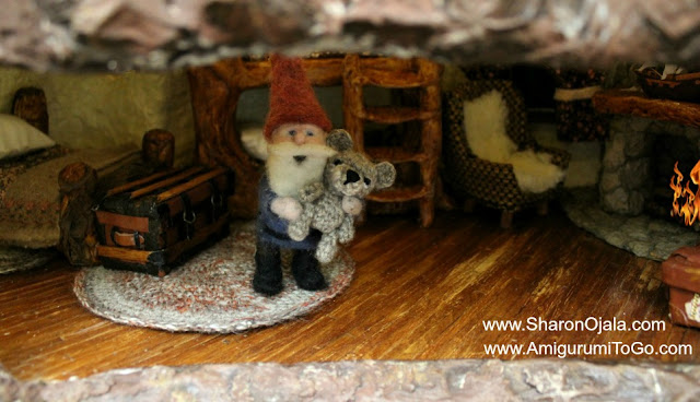 Pictured in the cover photo above, and with with Gnomey below, is Barley. I made him with handspun wool that was gifted to me. He turned out so adorable and you can tell Gnomey loves his bear!