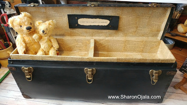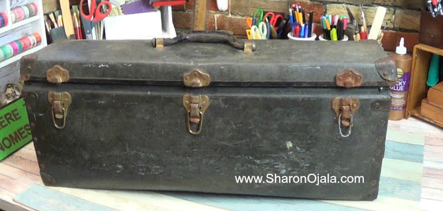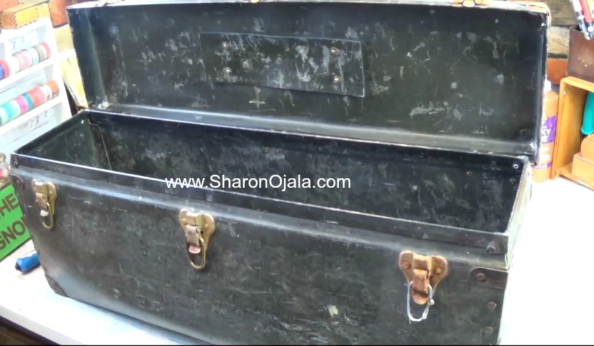 I recently found this old trunk sitting outside of a thrift store. It was raining that day so it was soaked, it was really dirty, and there was a bunch of bugs inside it. The wet sticker on the top said 5 bucks. What a deal! My Dad always says the bugs are free so I paid the 5 bucks and took it home.